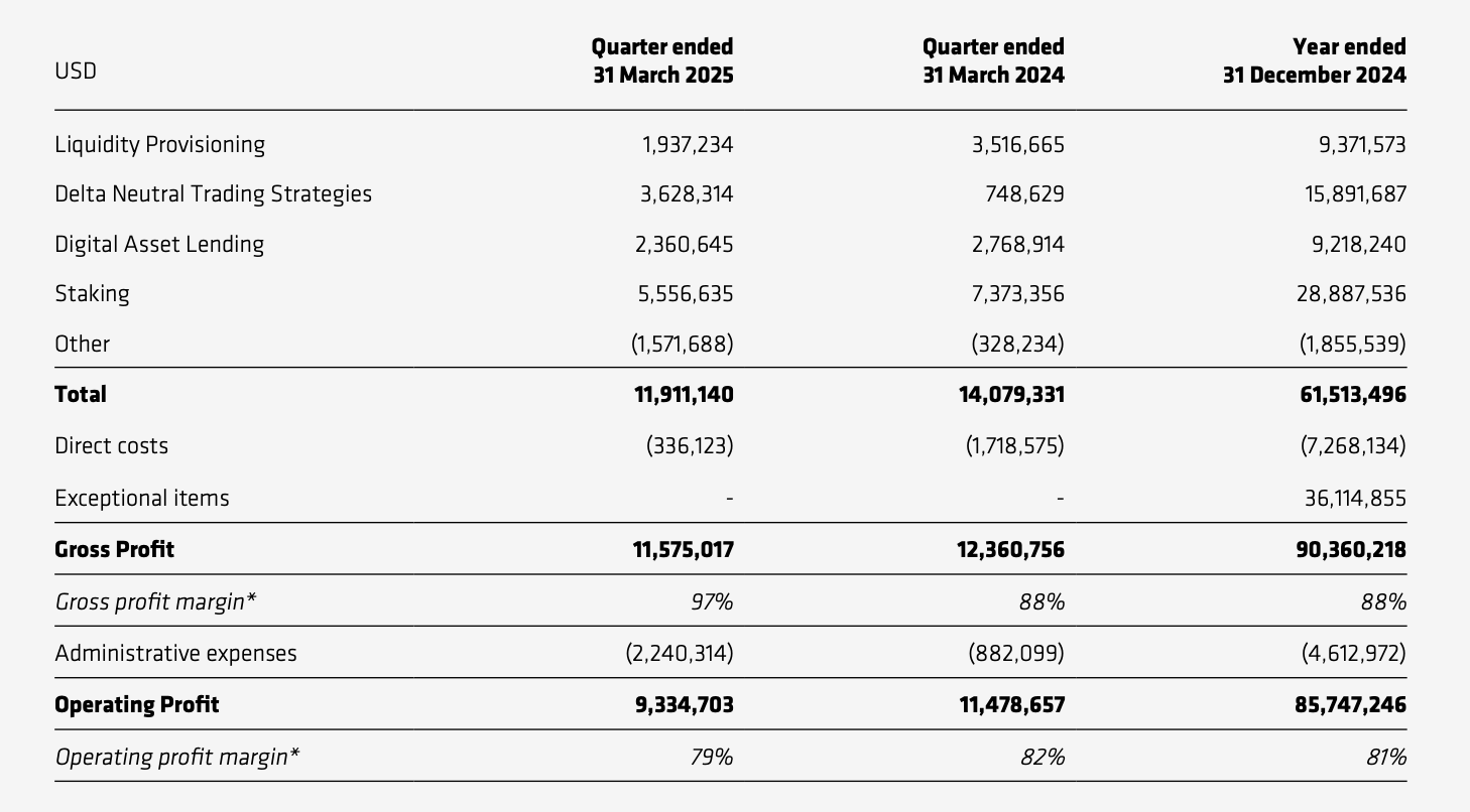资本市场基础设施业务上,CoinShares 一季度录得约 1191.1 万美元,同比下滑约 15.4%。CoinShares 所谓的资本市场基础设施业务包括了提供流动性收入、Delta 中性交易策略收入、数字资产借贷以及质押收入。除去直接成本和行政费用后的利润约 933.5 万美元,同比下滑约 18.7%。