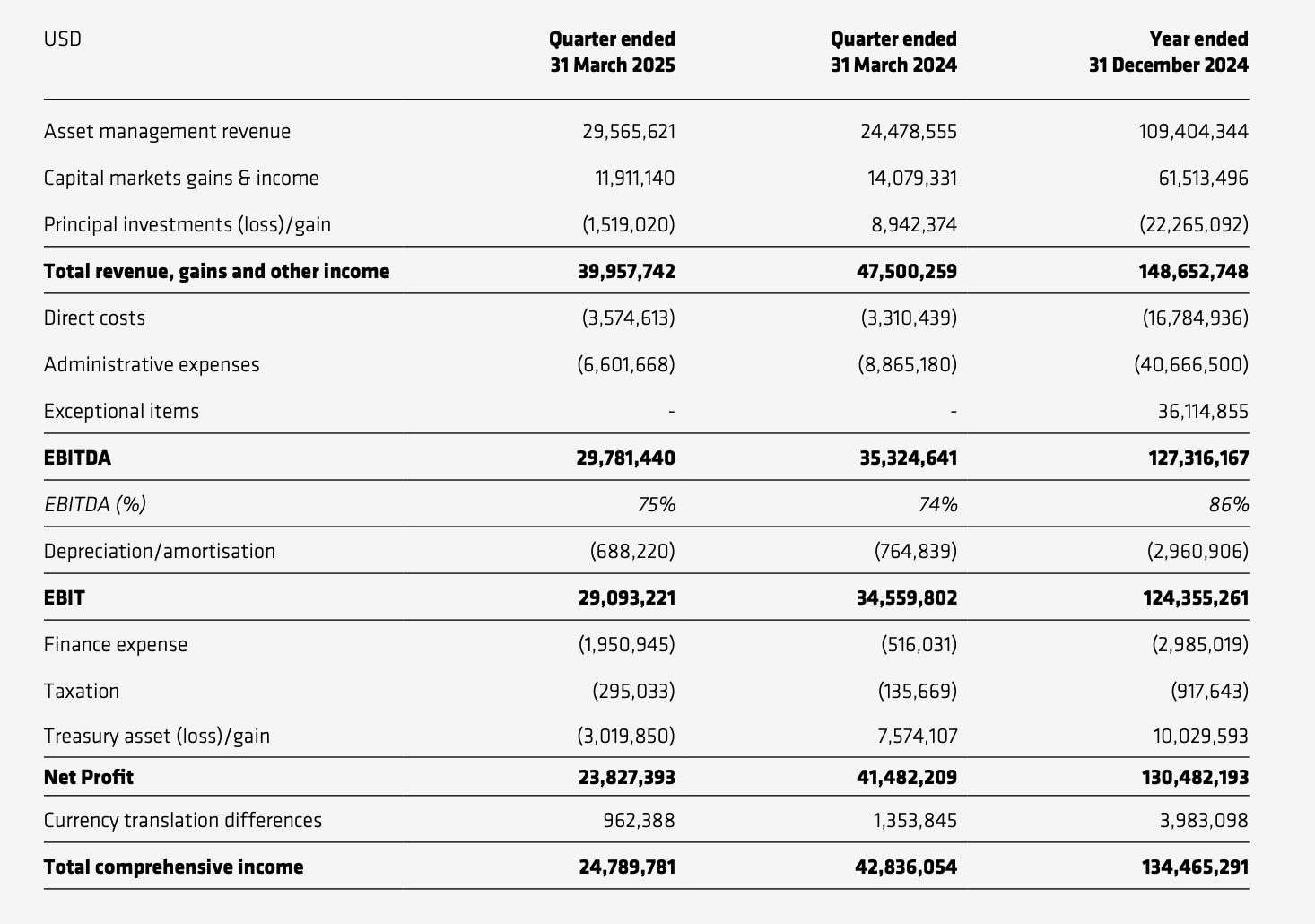 对整个上半年来说,由于 2024 年计入了 FlowBank 破产的亏损以及出售 FTX 债权的收入,故数据有些失真(收入同比的大幅增长也因此出现异常),除去这部分数据来看 CoinShares 今年上半年的表现与去年同期相比变化不大。