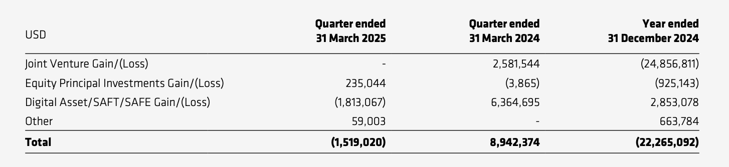 自有投资业务上,CoinShares 一季度亏损约 151.9 万美元,去年同期盈利约 894.2 万美元,同比暴跌约 117%。