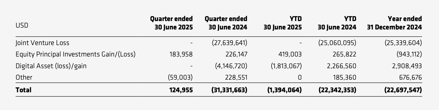 自有投资业务上,CoinShares 二季度仅有近 12.5 万美元的盈利,虽然相比一季度约 151.9 万美元的亏损有一定增长,但投资的亏损与盈利在时间上有一些随机性,参考性不强。值得注意的是,CoinShares 在 2024 年整年和 2025 年至今在投资上一直处于亏损状态,2023 年全年 CoinShares 在投资上还实现了近 370 万美元利润。