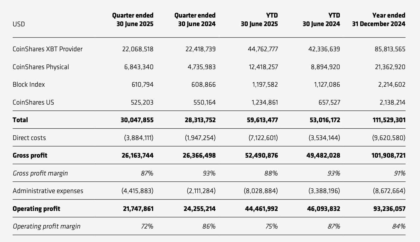 资管业务上,CoinShares 二季度收入略超 3000 万美元,环比微涨 1.6%,同比增长 6.1%。运营利润 2174.8 万美元,环比下滑约 4.3%,同比下滑约 10.3%。上半年 CoinShares 资管业务总收入约 5961.3 万美元,同比增长 12.4%,运营利润 4446.2 万美元,同比下降 3.5%。